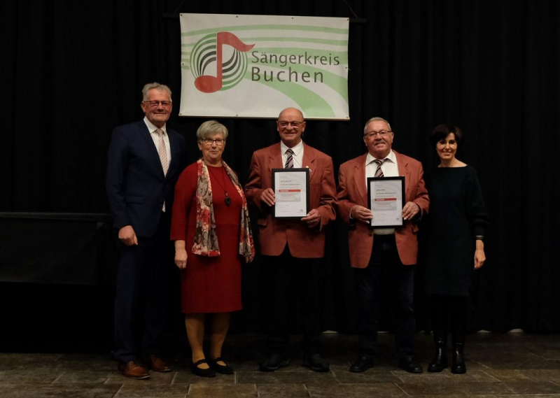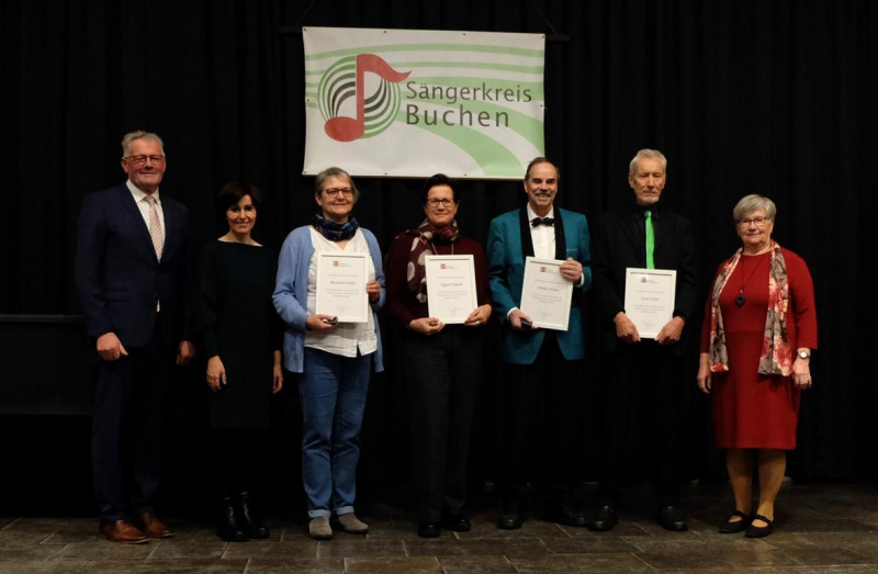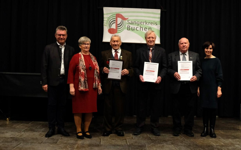 Georg Berberich und Anton Schell vom Gesangverein Höpfingen; Sabine Neidig Haas vom Konzertchor Cantamus, MGV Liederkranz Buchen, Monika Schmitt vom Gesangverein Eintracht Götzingen und Petra Schlegel, Gesangverein Hardheim duften die goldene Ehrennadel des Deutschen Chorverbandes für 50 Jahre entgegennehmen.
