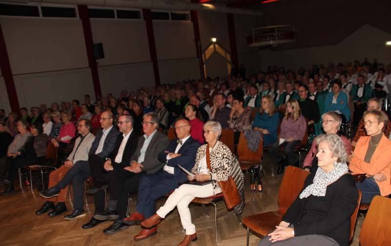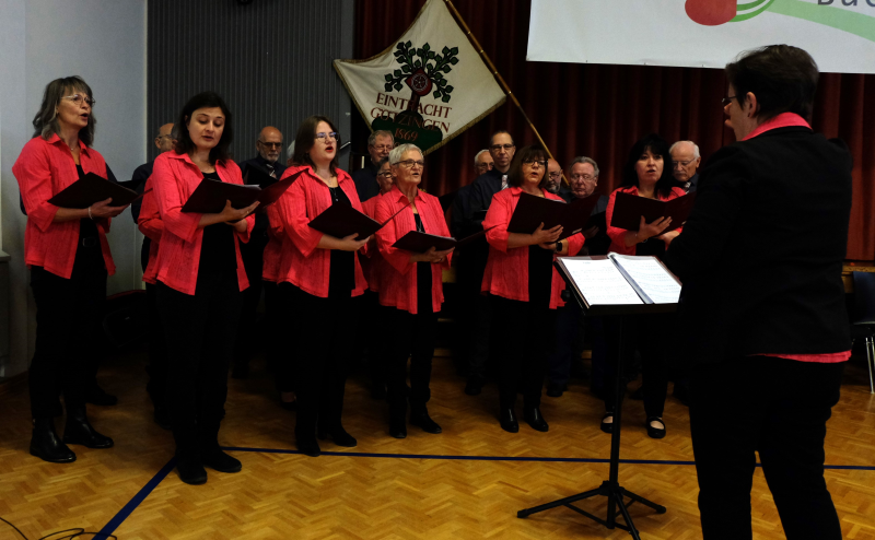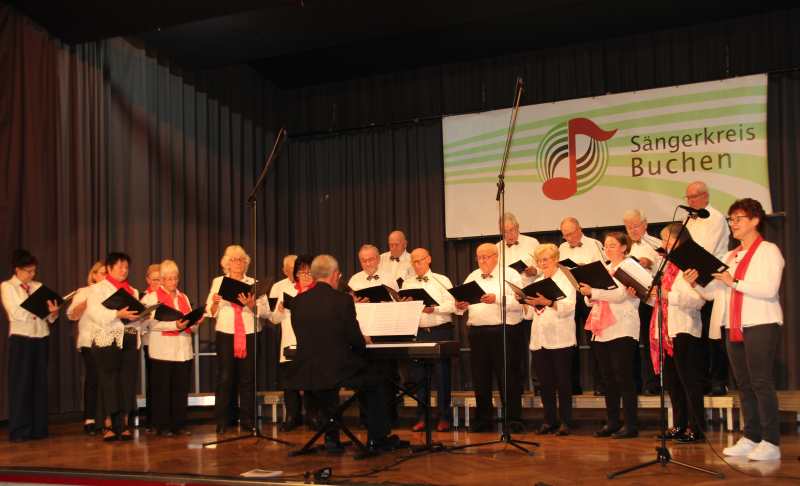 Mit der Volksweise aus Franken „Wohlauf die Luft ist frisch und rein“ eröffnete der Gastgeber, unter Chorleiter Michael Wüst und forderte auf „Lasst und das Leben genießen, lasset uns recht fröhlich sein, denn die Zeiten sie kehren nicht wieder, trinket aus, schenket ein“. Dass Lieder die besten Freunde sind und immer für dich da sind, ob in dunklen oder glücklichen Zeiten, erkannten auch die Sängerinnen und Sänger des gemischten Chores vom Gesangverein Höpfingen unter Chorleiter Gerhard Bönig und sie empfahlen „Nimm dir Zeit, werde still, wenn ein Lied erklingt“. Der Männerchor aus Hainstadt mit Chorleiter Sebastian Scheuermann wünschte sich „ An Tagen wie diesen, Unendlichkeit“ und rief sehr einfühlsam mit „Altes Fieber“ von den Toten Hosen, Erinnerungen wach, die sich anfühlten als würde die Zeit stillstehen. Die Sängerinnen und Sänger vom Gesangverein Harmonie Hettigenbeuern mit Chorleiter Werner Scheuermann hatten das Lied „Memory“ aus dem Musical „Cats“ mitgebracht und gaben mit „I will follow him“, mit Solistin Regina Eck, aus dem Musical „Sister Act“ einen Einblick in das Musicalprojekt, das anlässlich ihres eigenen 70jährigen Jubiläums einstudiert wurde. Begleitet wurden die Sängerinnen und Sänger am Klavier von Sebastian Scheuermann. Musikalische A cappella Grüße überbrachten die Sänger des Männergesangvereins „Eintracht Gerichtstetten“ mit Chorleiter Dieter Kaiser mit dem „Trinklied“. Sie erkannten, dass es immer einen Grund gibt guten Wein zu trinken, egal ob die Sonne scheint, Regen fällt oder ob es schneit. Mit der Volksweise „Wohl ist die Welt so groß und weit“ entführten sie in die Südtiroler Bergwelt. Auch der Männerchor „Cantus M“ vom Gesangverein Liederkranz Buchen mit Chorleiter Michael Wüst erkannte „Wem Gott will rechte Gunst erweisen, den schickt er in die weite Welt“ und überzeugte die Zuhörer mit „La Montanara“, gesungen in italienischer Originalsprache, als Solist glänzte Rainer Adrian. „Go with a song in your heart“ wünschten die Sängerinnen und Sänger des Gesangverein Frohsinn Mudau mit Chorleiter Gerhard Bönig und versicherten „You’ll never walk Alone“, von Richard Rogers. Die Sängerinnen und Sänger des Konzertchores Cantamus, MGV Liederkranz Buchen, entführten die Zuhörer mit „Sur le pont d’Avignon“ nach Frankreich und erkannten wie einst John Lennon & Paul McCarney mit „Can’t buy me Love“, dass man wahre Liebe nicht kaufen kann. Stimmgewaltig ging es weiter mit einem gemischten Gemeinschaftschor unter Leitung von Michael Wüst bestehend aus „Cantamus Buchen und Frohsinn Walldürn“ mit „Stimmt an der Freude Lobgesang“, ehe der gemischte Chor des MGV Frohsinn den „Frühlingsgesang“ von Rolf Herbst zum Besten gab und anschließend eine Liebesgeschichte „Im Café de la Paix in Paris“, beschrieb.