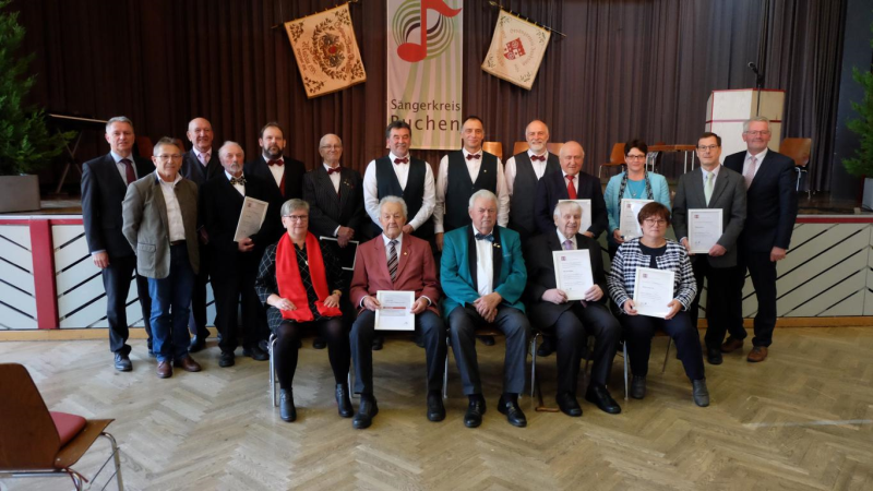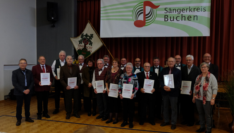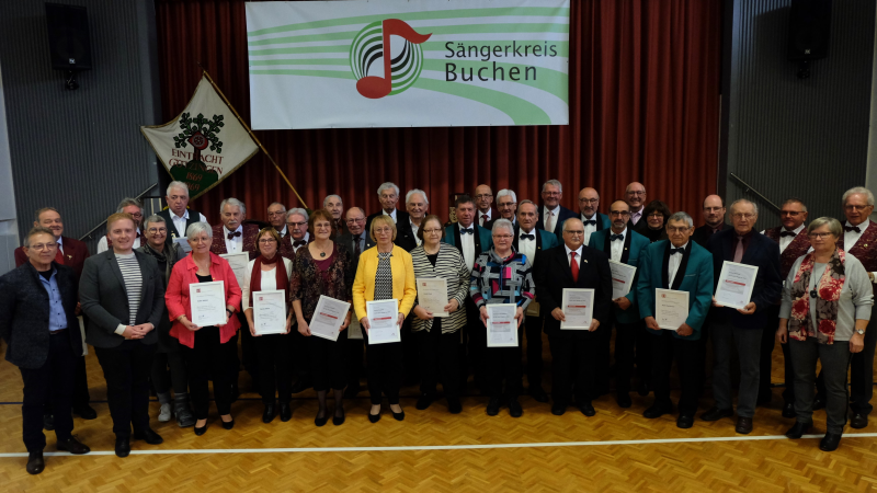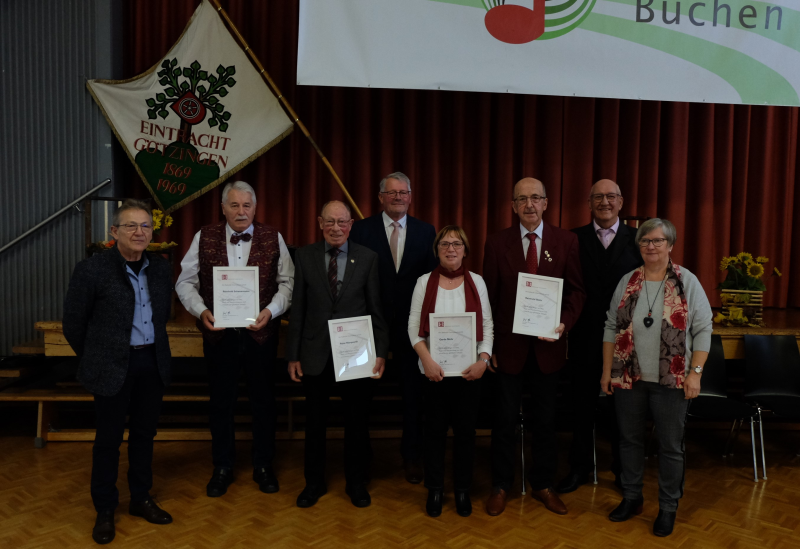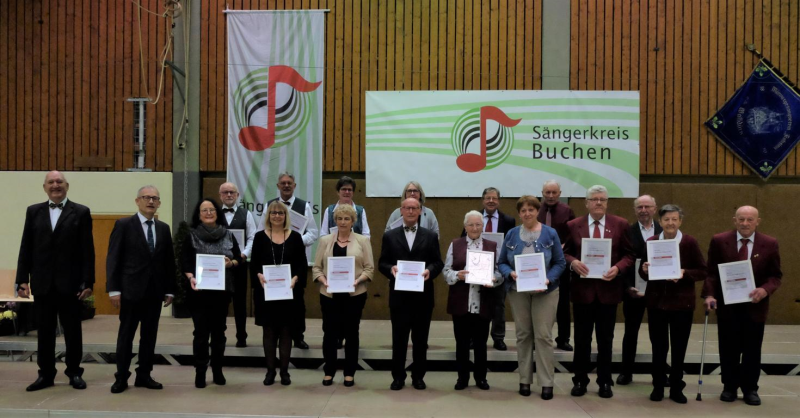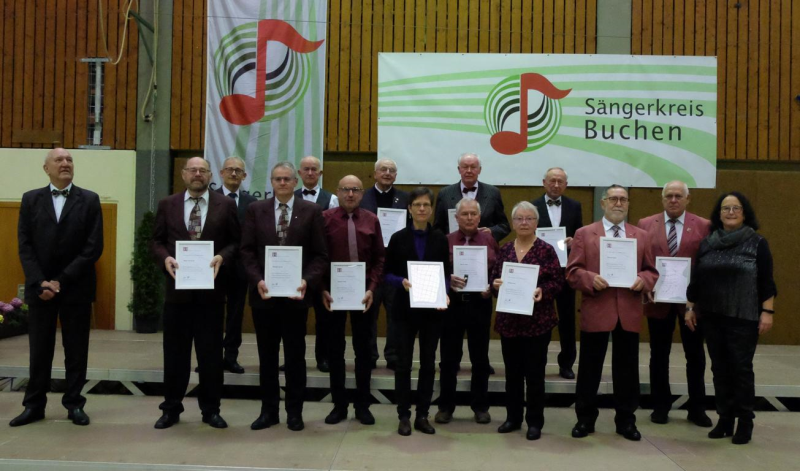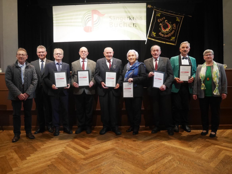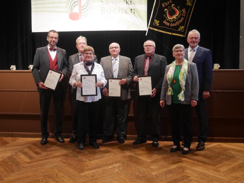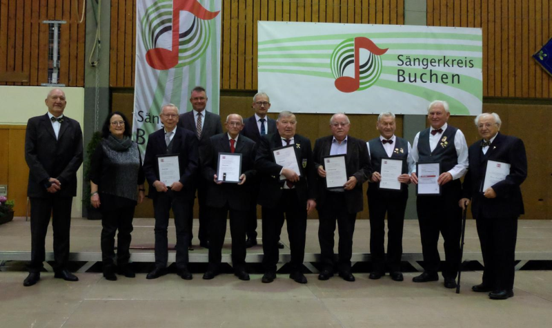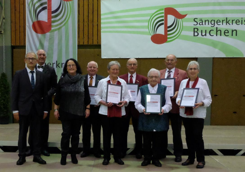 Mit der Goldenen Ehrennadel des Deutschen Chorverbandes für 60 Jahre Singen wurden ausgezeichnet: Renate Gogollok, Gesangverein Liederkranz Eberstadt; Kurt Henn und Helmut Pöpperl, Gesangverein Liederkranz Buchen; Manfred Pfeiffer, Chorgemeinschaft Rippberg; Klaus Scheuermann Gesangverein Harmonie Schoßau und Rosel Böttcher vom Gesangverein Frohsinn Waldstetten.